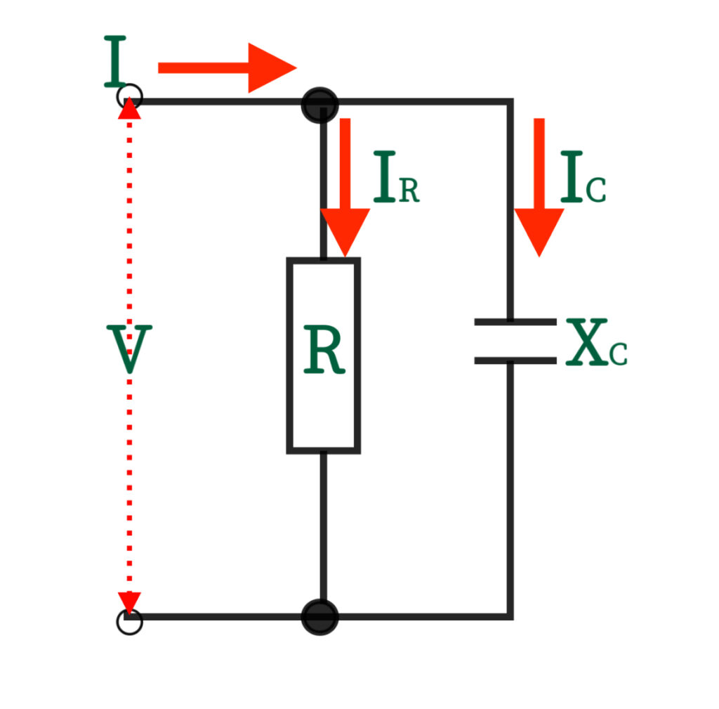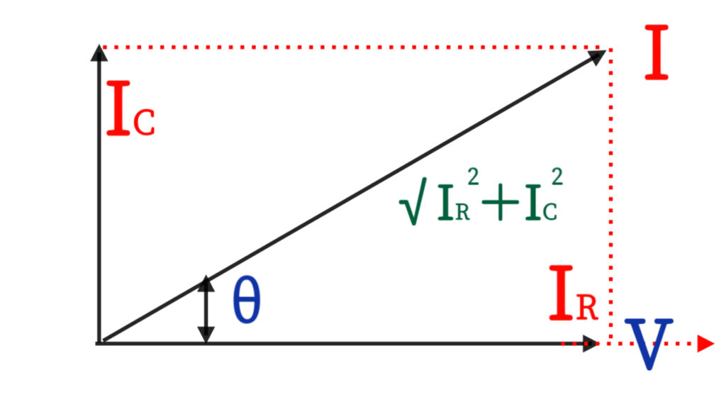合成電流 I は IR と IC をベクトル合成した長さ で決まります。